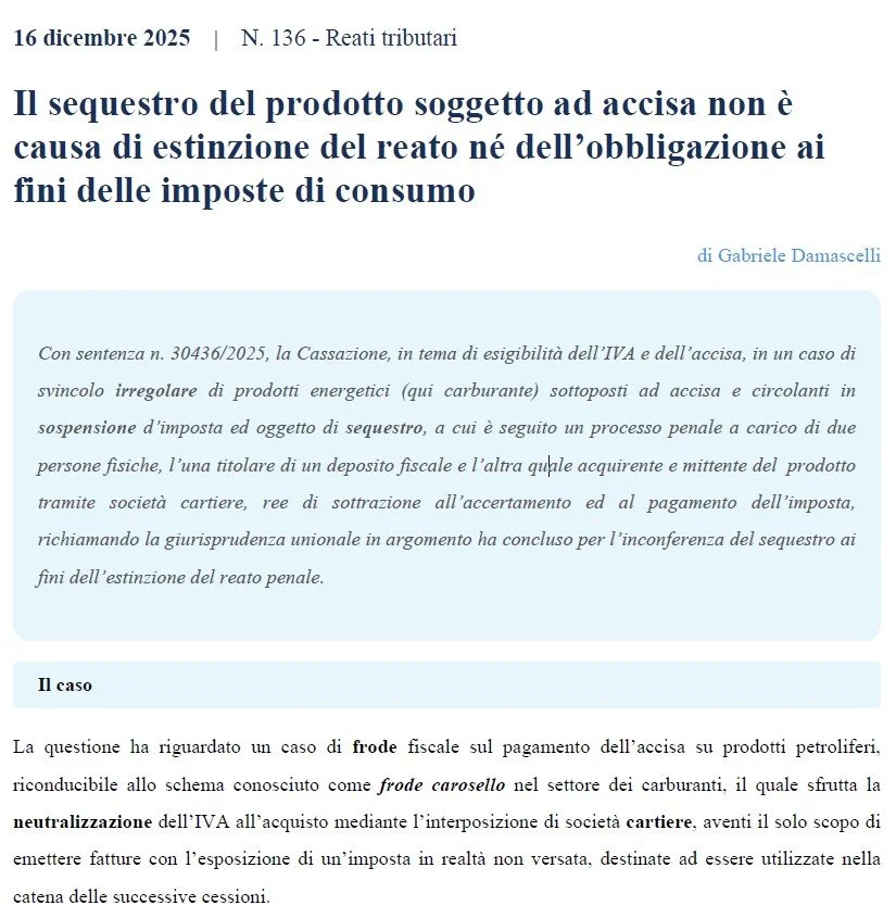 Il sequestro del prodotto soggetto ad accisa non è causa di estinzione del reato né dell’obbligazione ai fini delle imposte di consumo.