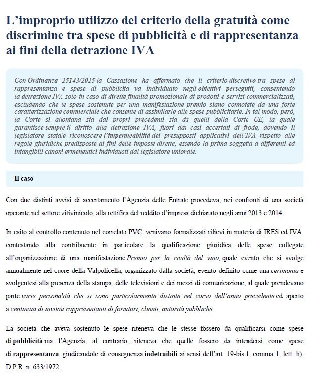 L’improprio utilizzo del criterio della gratuità come discrimine tra spese di pubblicità e di rappresentanza ai fini della detrazione IVA. IVA 4 dic Scritto da Gabriele Damascelli L’articolo qui riportato è un estratto. L’articolo completo è disponibile su Seac all-in fisco. Gabriele Damascelli